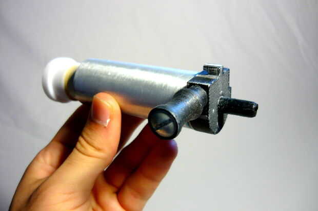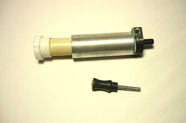 La cabeza del cilindro se debe pegar (con resina) en el cilindro de la bomba de bicicleta que habrá cortes 68 mm de largo, luego la cabeza de pistón y capturas se deben pegar al tubo de PVC que habrá corte 72 mm de largo. Una sección larga de 30 mm de tubo de irrigación de 7mmOD puede entonces insertado en la parte delantera de la culata. Por último, perno de la manija en el lado de la culata y voila! Su perno es completa.