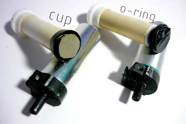 La bomba de bicicleta debe ser de aproximadamente 28mm de diámetro para caber en el receptor superior. Como se puede ver, hay dos tipos principales de bicicletas bomba-tazas y juntas tóricas. Anillos O darle un buen sellado a alta velocidad, así que uno de ellos si puedes.