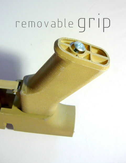El mango se fija en una manera similar a las armas reales, donde un perno se inserta a través de la base de la empuñadura hacia arriba en el recibidor inferior. Las ranuras verticales en la empuñadura de evitar cualquier movimiento indeseado remite/al revés.