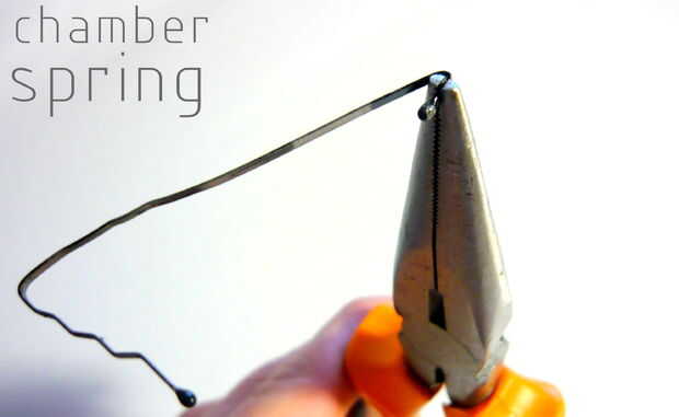 El resorte de la cámara impide que se caiga dentro del Recibidor superior cuando el perno se tira hacia atrás y sale de la boquilla de la cámara, algo llaman 'contracorriente' de bb. Fue un desafío de diseño realmente molesto como yo no estaba dispuesto a fijar el cilindro en su lugar y que tire hacia atrás el émbolo para amartillar el arma. Pero otra vez la horquilla fiel salva el día!
