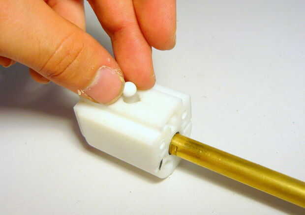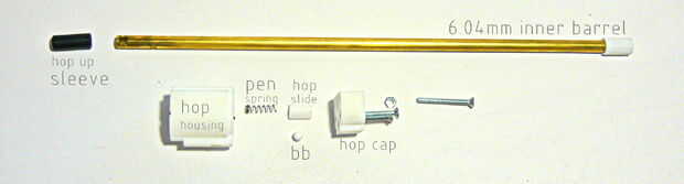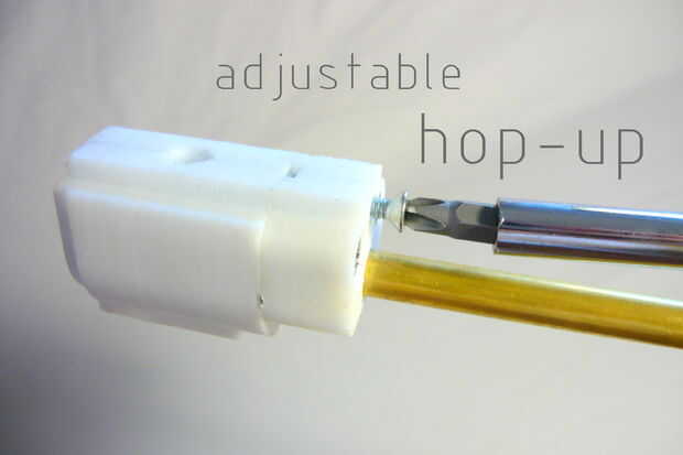 Pasar a la unidad de salto ahora. Si no eres un airsofter, hop-up es backspin en la bb que le permite viajar más lejos, el bb literalmente 'saltos encima de' en lugar de caer temprano. Esta unidad presiona una manga de goma hacia abajo en el barril para que cuando el bb pasa, coge un poco, dándole backspin.
