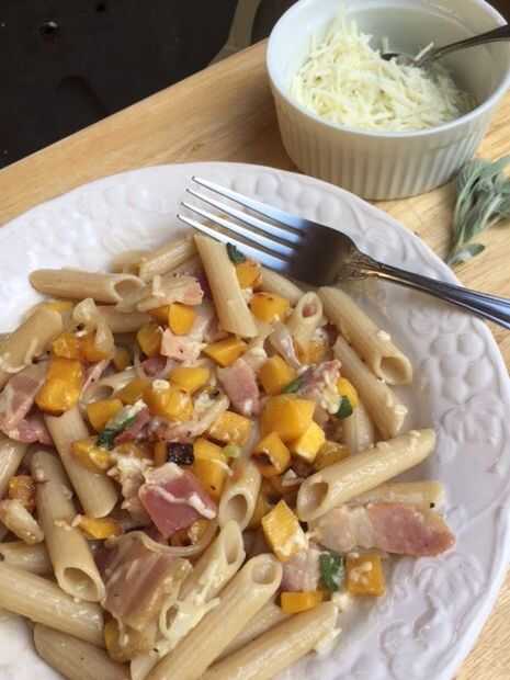 Estos son unos buenos motivos para disfrutar de hacer en tu propia cocina: Rigate libre de Gluten con calabaza asada y tocino ahumado, que llama para el uso de Salvia fresca.