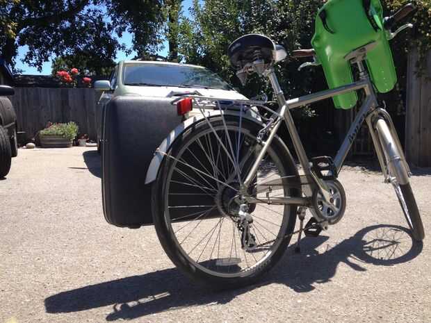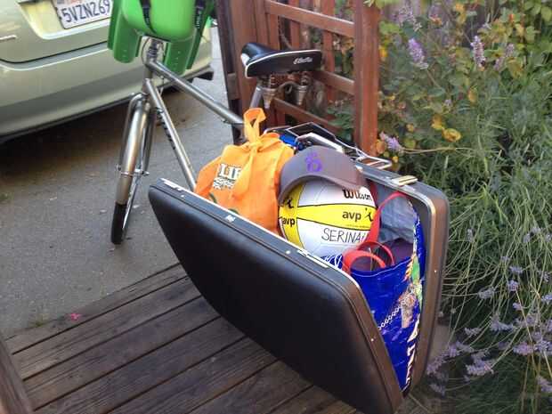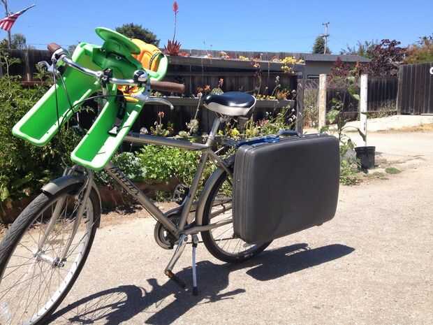 Terminé este proyecto con El CADILLAC de alforjas. Es una maleta gigante pero maniobrable, llamativo, rígida hecha de una maleta vintage. Al igual que una vuelta en carro de la estación con paneles de madera de Papá, cuando tomo mis maletas a mi conseguirán miradas registrar en el espectro entre puro asombro e incredulidad cómico. No es broma, la gente me dejaron para fotos. La economía de equipaje usado es tales que una maleta rígida como este conjuntos de copia de sólo $5 en la tienda. Agregar $10 para las tuercas, pernos, ganchos y cadena, y ya tienes un pannier jefe por $15.
