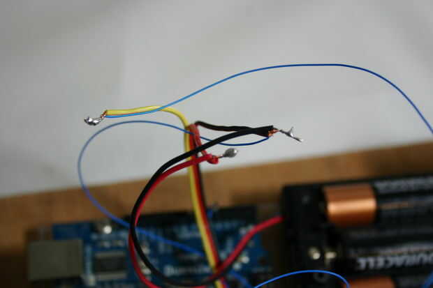 La soldadura de los cables del servo motor/batería y Arduino.  Cinta adhesiva con cinta aislante para evitar cortocircuitos.