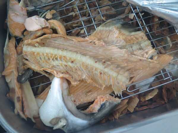 Escurra las virutas y los ponen en la sartén. Poner la parrilla sobre esto y ponga los peces piezas en él. Cubrir bien con papel de aluminio y ponerlo sobre una hornilla en la estufa a fuego bajo. Fumar durante 1 hora.