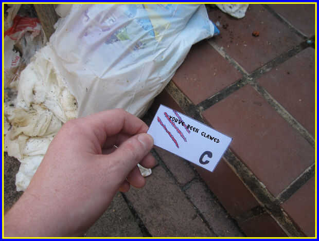 Como estaba dejando la casa para ir hacia el garaje inmediatamente pisé algo blandita los pasos atrás. Cuando miré hacia abajo vi basura esparcido en el patio y dos bolsas de plástico triturados. Mi estómago se hundió. Esto no podía estar pasando. Mientras continuaba a la zona descubrí lo... la tarjeta de llamadas. La garra había golpeado mi patio trasero. Como ustedes saben, la garra es un mal...-no, malo es no suficiente palabra... una criatura de mapache mutante malvado que depreda la basura y el reciclaje de contenedores en busca de alimento para alimentar su imperio. No podía creer que él era en nuestro barrio, sobre todo después de mi reciente introducción de los tres gnomos de superhéroe: