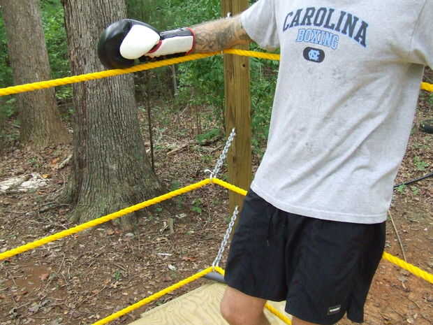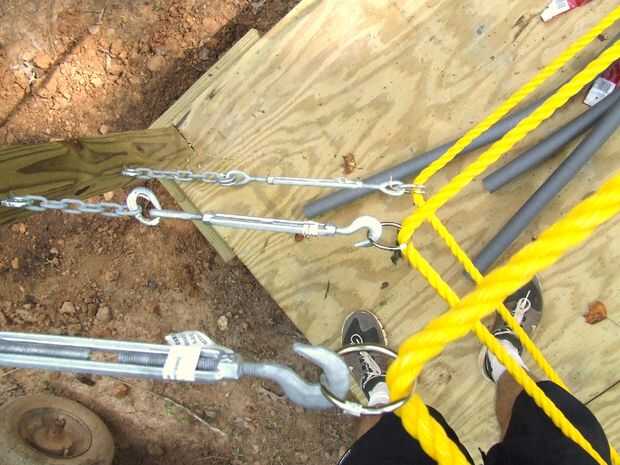 2) una cuerda a la vez, ejecutar a través de los lazos (hemos utilizado carabeeners y eslabones de parche) que se unen a las cadenas y girar las hebillas.