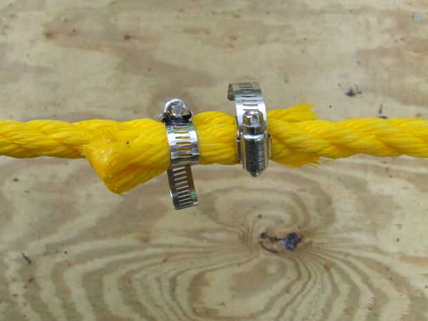 4) después de ajustes de mira a la derecho, utilizar dos abrazaderas para unir los extremos de la cuerda. Apriete la vuelta buckes y comprobar su trabajo. La cuerda de abajo debe tener vuelta hebillas a cada lado del anillo, las otras cuerdas parecen bien con sólo uno.