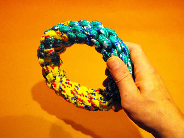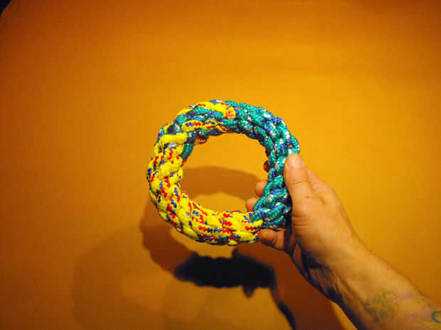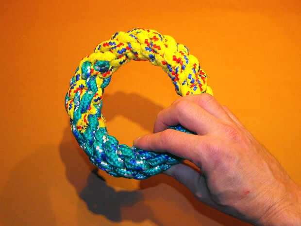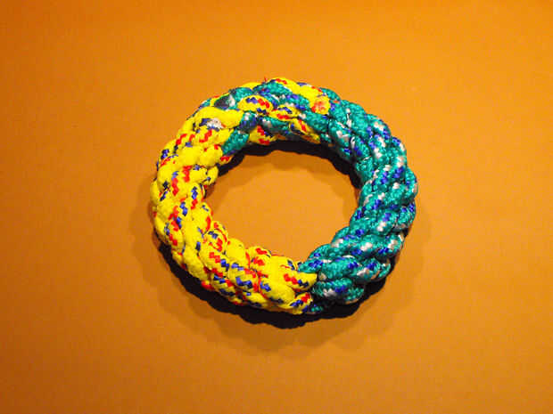Crear este juguete de perro anillo bicolor combinando dos longitudes del nudo de corona del 4 filamento básico. Ajustar fácilmente el tamaño y la escala de este juguete basado en la cuerda o el tamaño de su mascota. Para 3/8" cuerda figura 4" de la cuerda para todos 1" del nudo terminado, es decir: utiliza el nudo terminado 6" 24" de la cuerda.