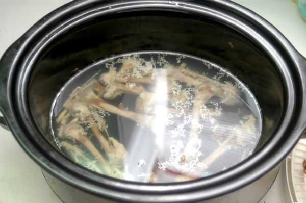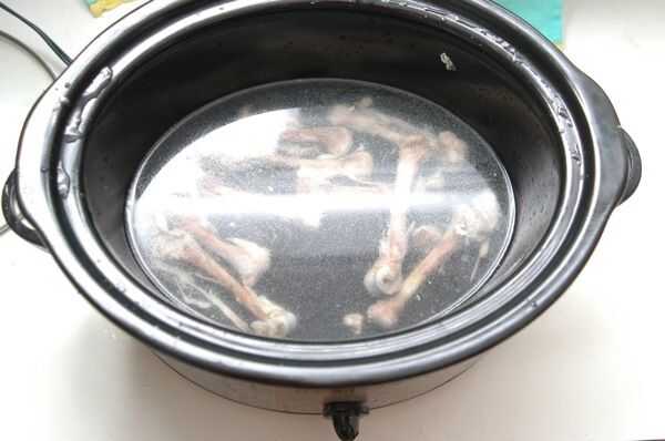 Vuelva a colocar los huesos en la olla con los restos de la grasa, añadir agua y dejar cocinar por varias horas para hacer un caldo, también por la receta.