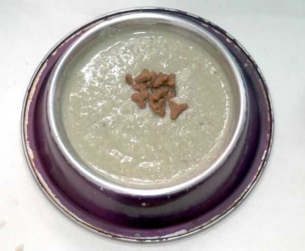 Yo solía añadir unos trozos de kibble holístico en la parte superior o mezclado. La razón de esto es que mi gato vivió en croquetas toda su vida antes de esta insuficiencia renal. No sabía que los gatos son animales del desierto acostumbrados a conseguir la mayor parte de su líquido de sus alimentos, y que estaba dañando su salud por dándole croquetas. Por lo tanto, se convirtió en condicionada a pensar "alimento" significa "croquetas", por lo que no era realmente hora de la comida para él a menos que él oyó el sonido de la caja de croquetas. Entonces él felizmente devoró su comida entera. Ahora él felizmente consume sus comidas libre de croquetas.