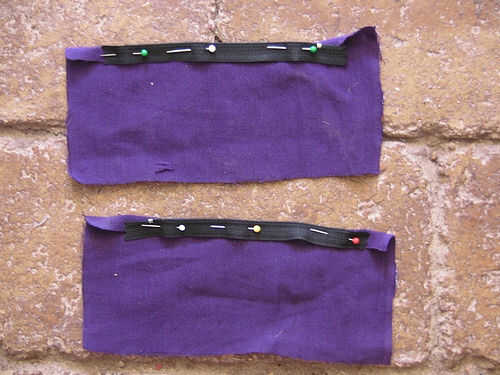 - Tomar 8" 10" trozos de tela. PIN a una media de una 7" cremallera en la parte superior de la tela (8") y pin la otra mitad a la parte inferior. Dóblalo a la mitad y comprobar que la cremallera funciona (que tiene las cremalleras puestas en al lado derecho de la tela y en la dirección correcta). Coserlas en lugar.