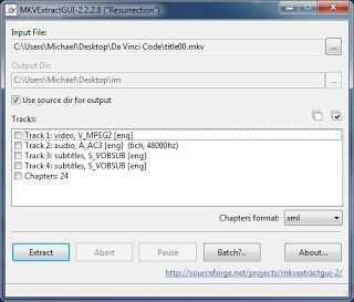 Terminado el MakeMKV, debe tener una carpeta con un archivo MKV en para cada título (para películas, este lo probable es sólo ser un MKV). Ejecuto el MKVExtract GUI y arrastre el archivo MKV.