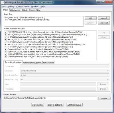 Una vez que tienes funcionando, añadiendo los dos archivos juntos es sencilla y no tarda mucho en todo. Simplemente haga clic en el botón Agregar, luego seleccione el primer archivo MKV, a continuación, haga clic en anexar (Nota: que se agregue la segunda vez no agregar!) y seleccionar el segundo archivo MKV. Usted debe terminar con algo que parece algo así como la captura de pantalla adjunta.