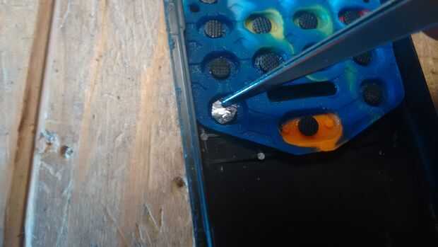 Ora mettete un poco di colla sul cerchietto conduttivo nero del tasto usando uno stuzzicadenti o un piccolo cacciavite: troppa no usate colla, deve essere la quantità necesaria por coprire TUTTA la superficie del cerchio conduttivo con strato sottile de las Naciones Unidas.