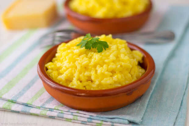 A medio camino a través del proceso añadir azafrán al arroz y mezclar para obtener color amarillo agradable (comience con una pequeña cantidad de azafrán, si lo prefiere un tono más oscuro del amarillo, añadir más).