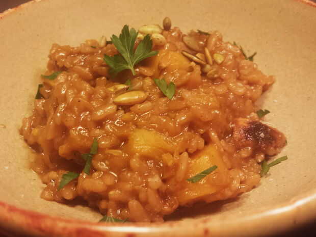 Risotto de calabaza asada es una comida super confort cocido lento con la adición de la quinua. Qué gran manera de utilizar verduras coloridas antioxidantes saludables para añadir nutrición a cualquier comida. Se trata de un almuerzo de gran vegana/v