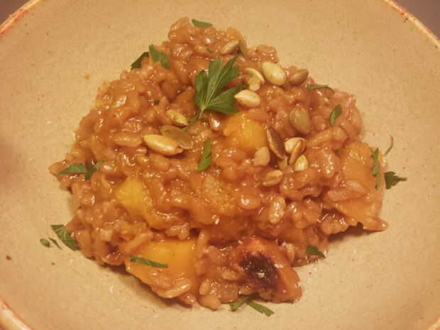 Risotto de calabaza asada es una comida super confort cocido lento con la adición de la quinua. Qué gran manera de utilizar verduras coloridas antioxidantes saludables para añadir nutrición a cualquier comida. Se trata de un almuerzo de gran vegana/v