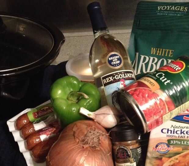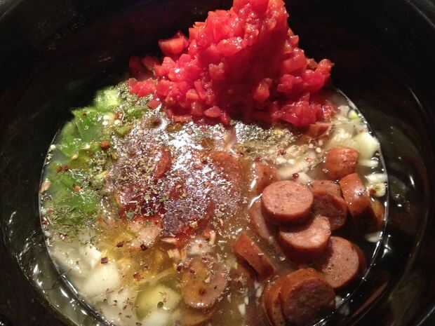 Líquidos en los ingredientes incluyen el caldo, vino, aceite de oliva, jugo en los tomates en cubitos, agua en las distintas verduras, etc.. Dependiendo de la temporada, la frescura de las verduras, el precio de los tomates enlatados y si empezaste muestreo el vino sobrante antes de medir los otros ingredientes, su preparación puede tener más líquido en ella a la mía. Si después de 2 horas la mezcla parece más como la sopa de un plato de arroz abundante, agregar otro 1/4 de taza de arroz de su reserva. Deje cocinar otros 30 minutos y revuelva. Si los materiales son aún caldosos, añadir el resto del arroz y cocinar otros 30 minutos.