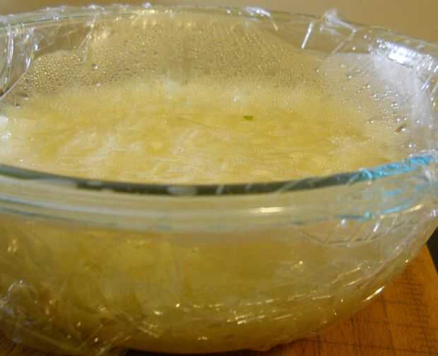 2. Agregue el caldo o caldo, cubrir con papel plástico y microondas durante unos 6 minutos (Asegúrese de usar guantes para el horno - el tazón de fuente caliente)