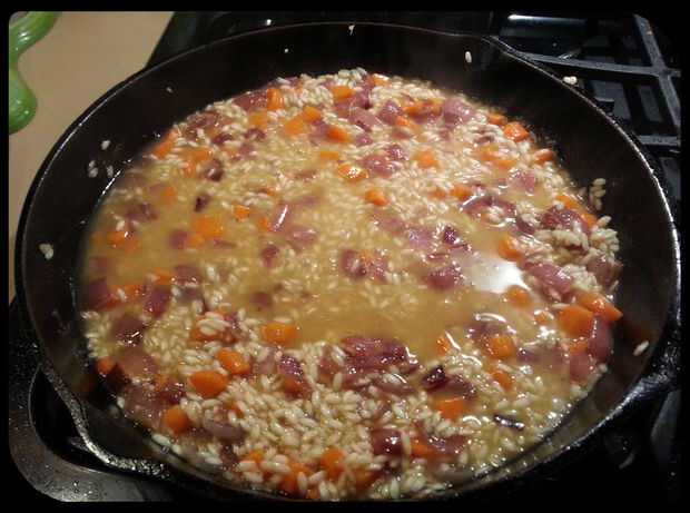 Risotto, tradicionalmente un norte plato italiano de arroz de grano corto cocido en acción, felicitó con mantequilla y vino blanco para terminar este plato. Risotto con frecuencia se cuece hasta que tenga una textura cremosa muy lujosa. Este plato ve