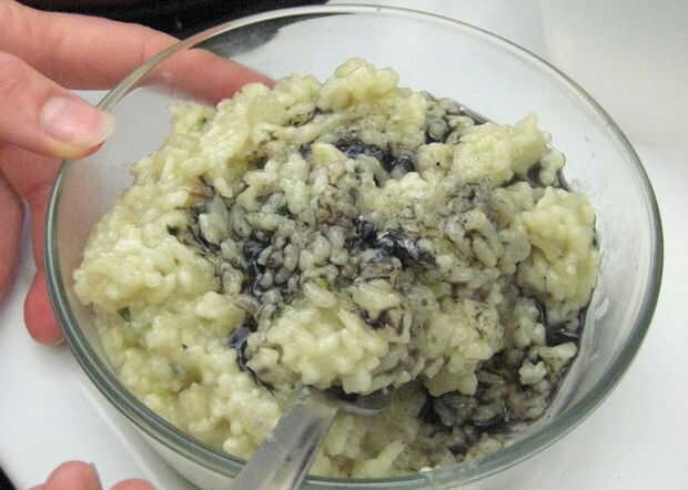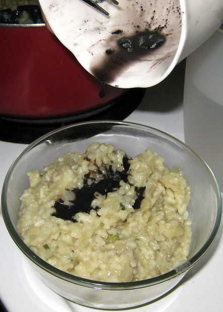 Si desea un color de tinta fuerte o específico, comience mezclando su tinta en una pequeña cantidad de risotto, luego diluir la mezcla con risotto más hasta que estés satisfecho con el color. He hecho esto para exagerar el efecto de color oscuro, como realmente cociné un montón de risotto, y sería casi imposible conseguir este tipo de color para el bote entero sin anotar un calamar muy grande.