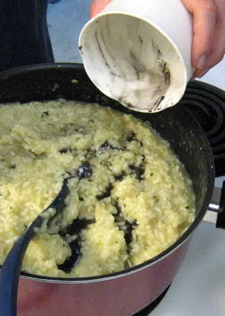 Enjuague el recipiente de tinta con un poco de agua, vino o caldo y revuelva el risotto a la tinta. El resto de la tinta debe aplastar hacia fuera y color el risotto, convirtiéndose un gris violáceo. El sabor muy suave y probablemente desaparecerán detrás de los sabores más fuertes en el risotto.