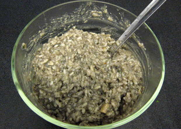 Tu risotto terminado debe ser bastante grueso, fragante y tinta (o no, dependiendo de tu gusto), con ningún líquido de permanente.