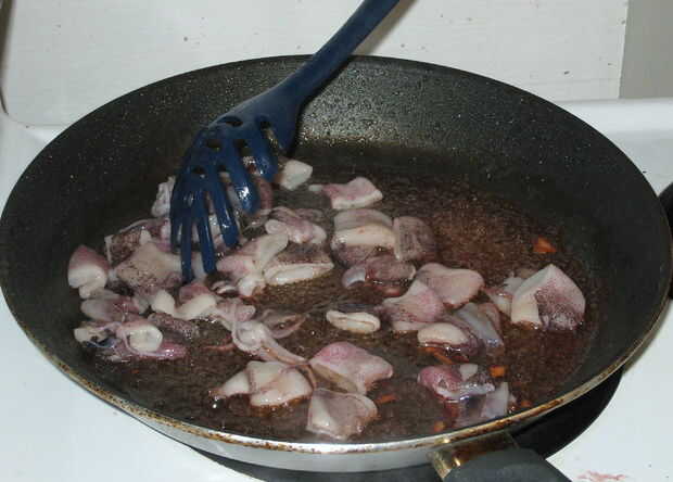 Tenga cuidado de no sobrecocinar, como calamar puede llegar a ser parecido a la goma después de más de un par de minutos de cocción. Alternativamente, cocinar el calamar de más de 30 minutos - se ablandará la carne, y el calamar será sabroso otra vez. Soy perezoso y prefieren el método de dos minutos, pero su kilometraje puede variar.