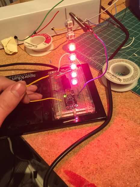 Una vez que haya terminado de una fila, probar tus franjas. Mi tester establecido era sólo el Abalorio en un protoboard, con algunos cables con pinzas de cocodrilo de soldado, que recorta energía, suelo y líneas de datos de mi banda (nota es mejor conectar tierra primero si está encendido, por lo que no lastima tus LEDs).