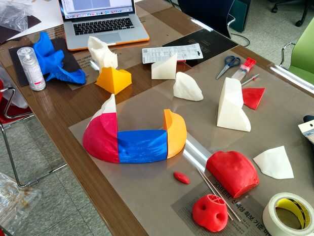 Con la altura de la capa 0,2 mm y 1,0 mm de espesor de cáscara, el tiempo de construcción estimado en Cura fue 60 horas en total. Así da una carga total de 180.000 KRW. Por suerte no había mucha gente alrededor, y pudimos correr 10 impresoras a la vez usando el filamento ABS.