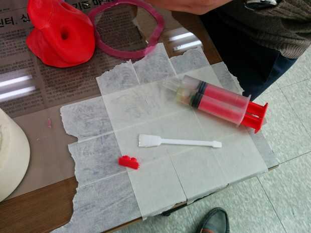 Recogimos las piezas impresas el día después y comenzó la Asamblea. He utilizado jeringa tipo Araldite para unir diferentes partes. Es un pegamento super fuerte consistió en dos tipos de resinas. Se debe mezclar bien antes de su uso. Tarda alrededor de 20 ~ 30 minutos completamente curado. Normalmente cubrir mesa con cintas adhesivas para la placa de una mezcla porque de esta manera el plate(?) está firmemente fija, barato y fácil a través de lejos después de su uso.