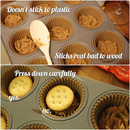 Extensión de un cuarto de pulgada o menos de goo sobre esa primera capa de Ritz ha establecido. Si utiliza una cuchara de madera, va ser muy difícil separarse de lo goo. El goo derecha se desliza fuera de plástico y es fácil de untar.