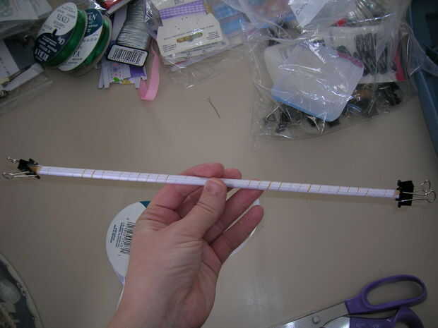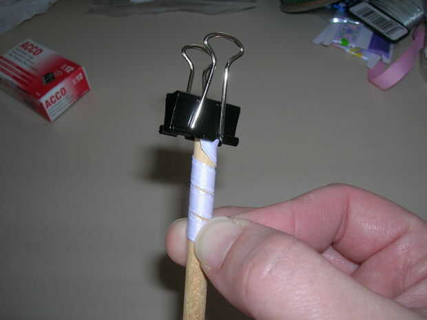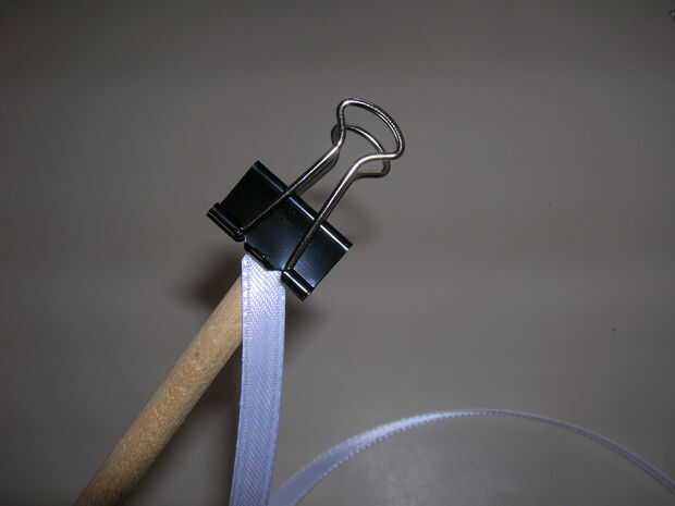 aquí es una rápida un clip de pelo fácil para hacer con niños.Se necesita: cinta del grosgrain de 3/8" para todo.Tendrá color de rosa, verde y amarillo.Corte a 22" de largo.1 pinza de cocodrilo.1 3/8" blanco cinta de cortar a la longitud de