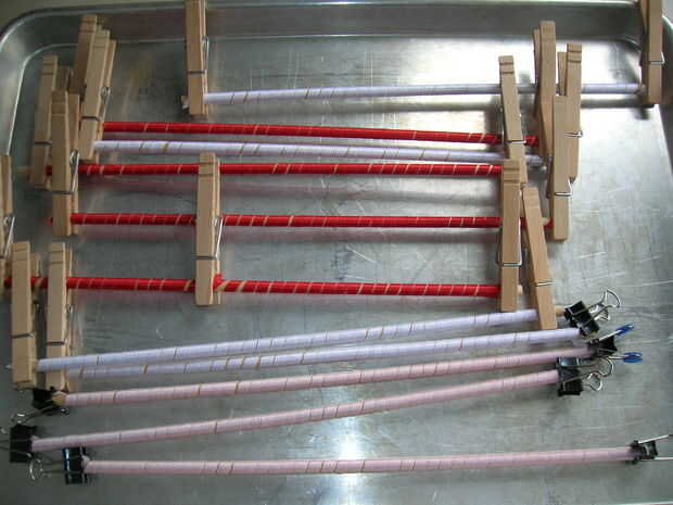 aquí es una rápida un clip de pelo fácil para hacer con niños.Se necesita: cinta del grosgrain de 3/8" para todo.Tendrá color de rosa, verde y amarillo.Corte a 22" de largo.1 pinza de cocodrilo.1 3/8" blanco cinta de cortar a la longitud de