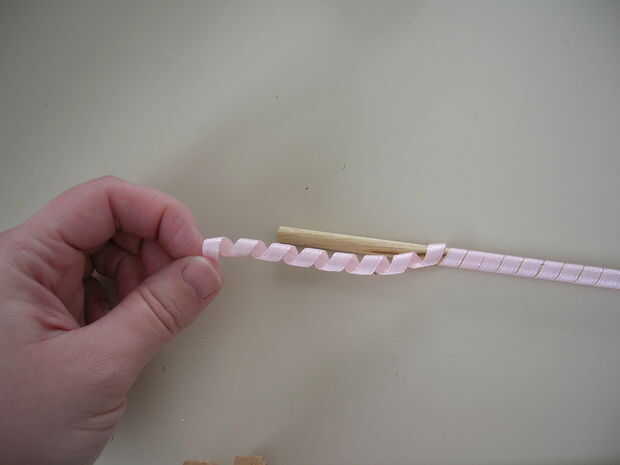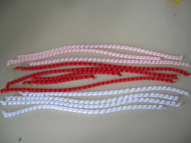 aquí es una rápida un clip de pelo fácil para hacer con niños.Se necesita: cinta del grosgrain de 3/8" para todo.Tendrá color de rosa, verde y amarillo.Corte a 22" de largo.1 pinza de cocodrilo.1 3/8" blanco cinta de cortar a la longitud de