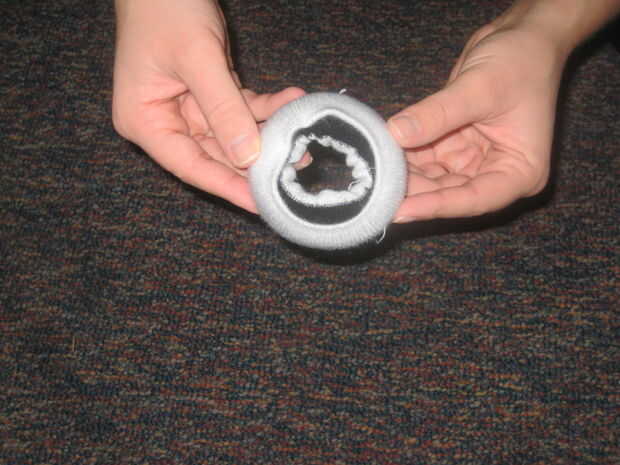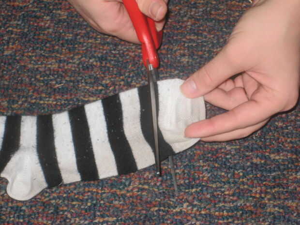 Cortar la punta de un calcetín limpio para hacer un tubo. Rodar de un extremo a otro para formar una forma de donut.