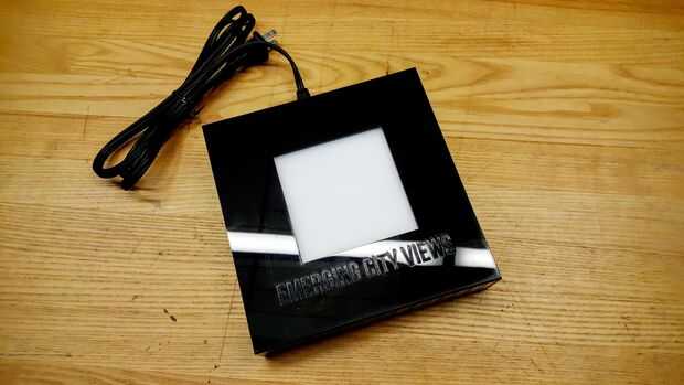 La caja externa sí mismo fue diseñada en Adobe Illustrator y cortar la forma para el efecto de un aspecto más pulido, con las palabras, "Vistas emergentes" (título de la pieza) en la frente para asegurarse de que los espectadores pudieron intercambiar las piezas ventana ocular que ve en las diferentes ciudades.