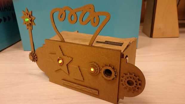 parte principal de este robot es cartón. El dorso es de cartón, la parte delantera, y por lo tanto es la parte inferior sosteniendo lo. Se puede mueve su cabeza y sus brazos. Para hacer este robot, usan una caja de zapatos de cartón, pegamento calien