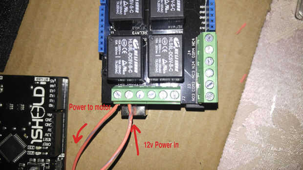 El escudo de relé de seeedstudio que estoy usando ahora está descatalogado, pero todavía puede encontrarlo en el shack de radio. Utiliza pernos 4-7 así como 5v y tierra. Conecte su fuente de 12v a comm y la carga de su motor NO (normalmente abierto). Si no tienes un escudo, conectar 5v de tu arduino a vcc en el módulo de relé y el pin 7 a 1. Asegúrese de que cable del diodo en la dirección correcta.