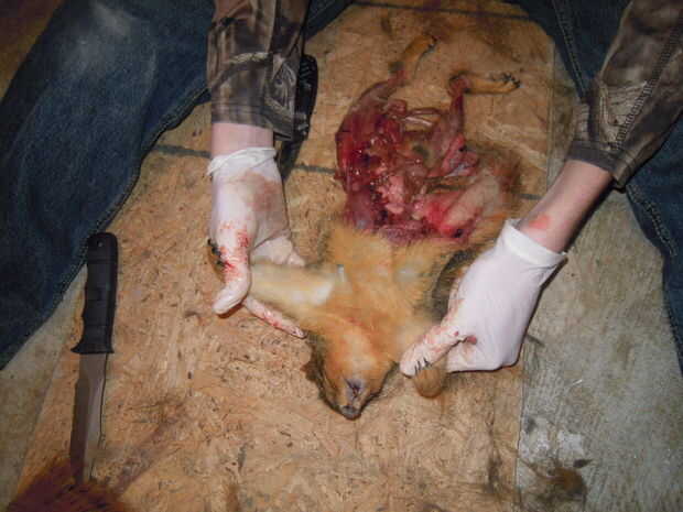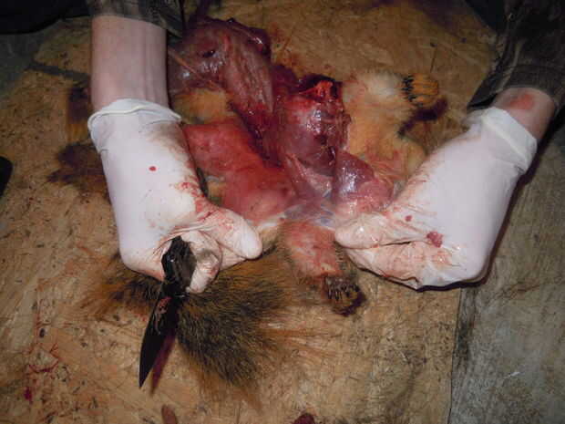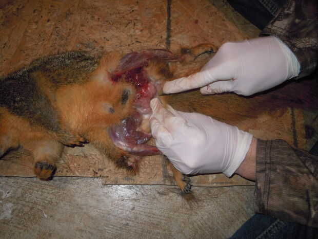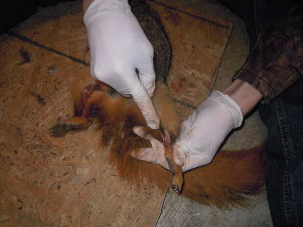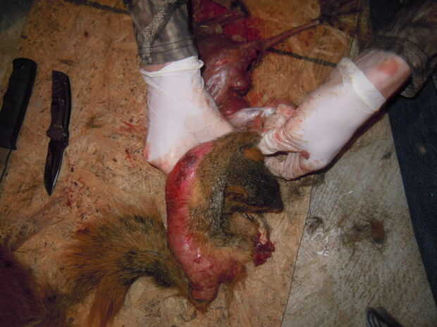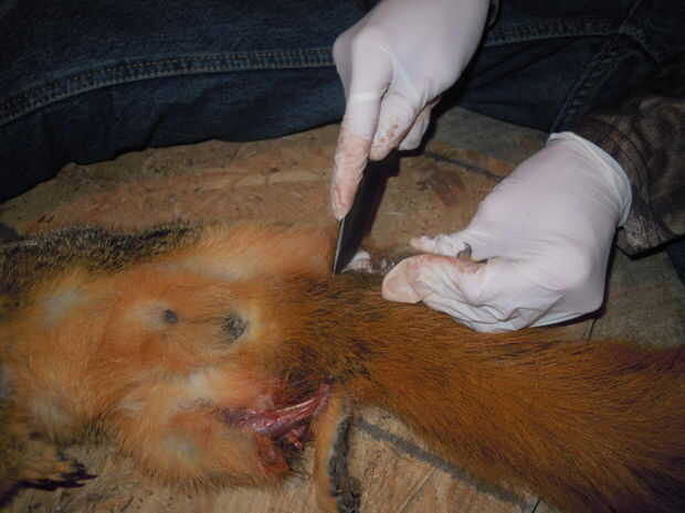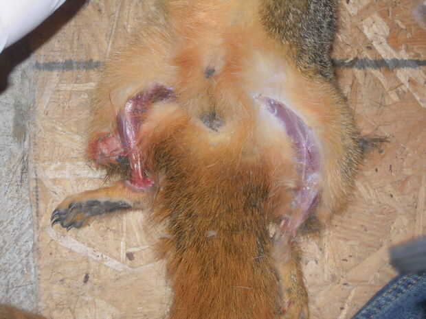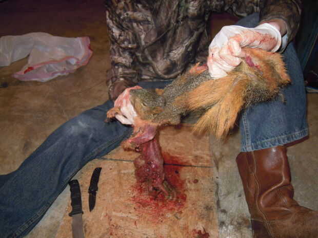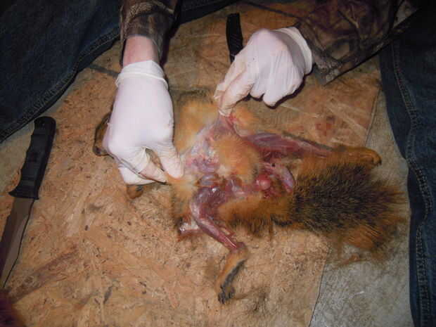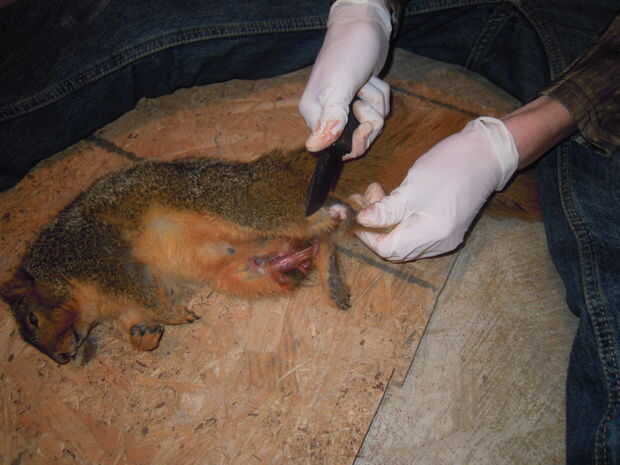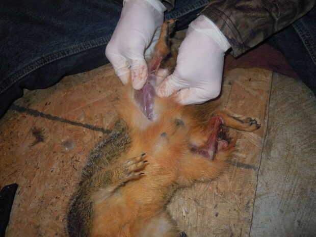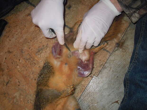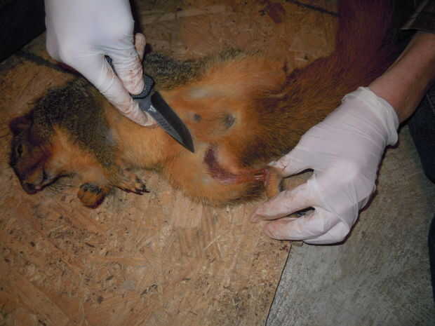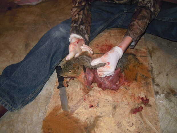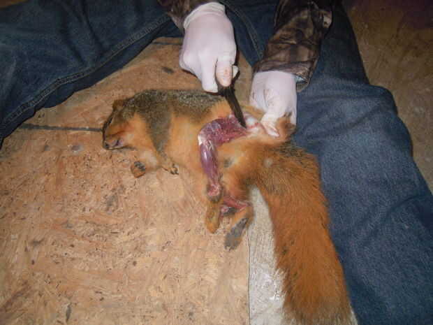 Now for the goods! Seguir adelante y poner en un par de guantes, como se pone un poco desordenado, pero más que eso, no quieren recoger las bacterias de la tripa del animal. Asegúrese de que el cuchillo es bueno y cuchillos afilados, sordos sólo piden recortar el haz. Empecé pelando esta ardilla con mi SOG Seal Pup pero resultó para ser un poco exagerada, así que cambia a mi cuchillo de bolsillo, y que funcionaba mucho mejor. Hay un montón de formas animales, de la piel de personas pero así parece que funciona bien, y la piel es una agradable forma al final. Primero corte alrededor de ambos tobillos, tratar y sólo se cortan a través de la piel, no todo el camino hasta el hueso. Luego pone la cara de ardilla vientre y cortar el interior de ambos hacia atrás las piernas, cuando llegas a soldados rasos de la ardilla. Una vez que has cortado por las patas traseras, cortadas un círculo alrededor de su privates (la piel de alrededor de esa zona no es cualquier cosa que usted querrá un producto terminado). En este punto usted puede cortar la cola y olvidarse de ella, o pueden lentamente y con cuidado cortar la cola y pelar la piel de él. Se sale la piel de mi cola, pero rasgado por la mitad y tuve que coser detrás juntos. Después de tratar con la cola, empezar a pelar la piel de las patas traseras y trocear progresivamente a lo largo del estómago hasta llegar a la base del cuello. Una vez tu con eso, corte alrededor de las patas delanteras y luego corte a lo largo de la parte interior de las patas delanteras hasta llegar a la incisión en el estómago. Una vez que hayas hecho esto, pelar la piel de las patas delanteras. Ahora agarra una bodega de la piel y tire de ella hasta que pela hasta la base del cuello. No te preocupes acerca de cómo la piel de la cabeza, simplemente cortado en la base del cuello. Ahí tiene, estilo de roadkill de piel de ardilla! Al hacer los cortes en la ardilla no cortar demasiado profundo, causar luego que terminan de engordar y muscular en la piel. Sólo se cortan a través de la piel no más profunda. He añadido un esquema de lo que estoy pelando por claridad.
