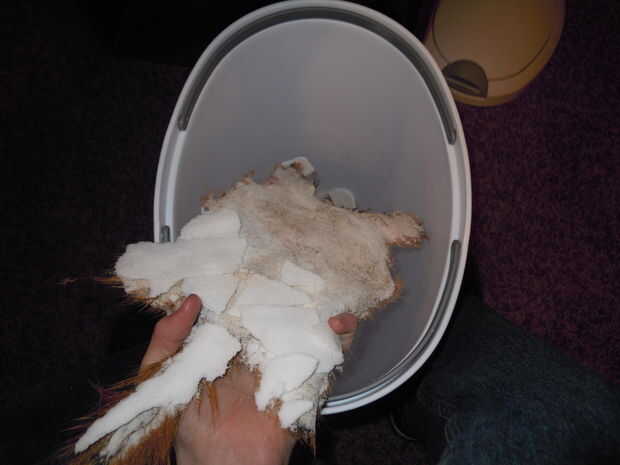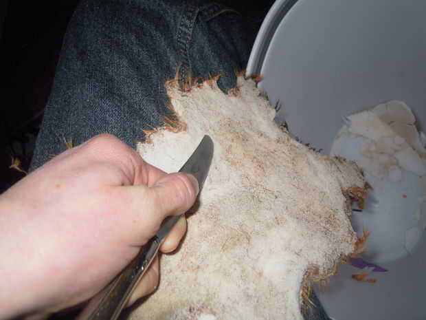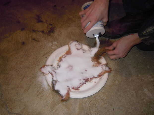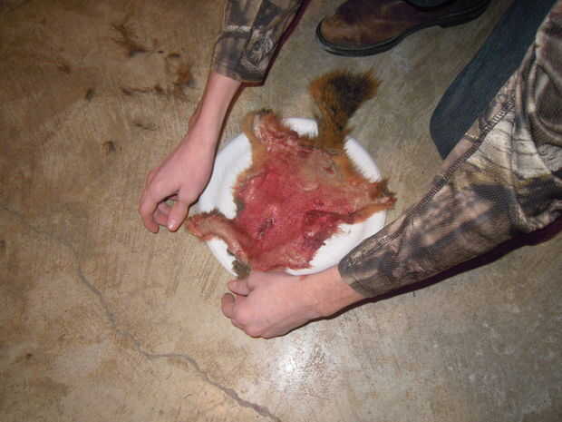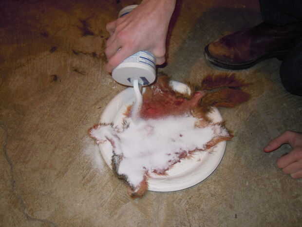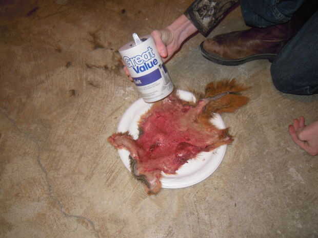 Lamentablemente nuestro roadkill Jalan aventura está a punto de llegar a su fin. Preservación de la piel es el último paso, después de salarlo que la piel se conserva. Sal atrae la humedad de la piel, ayuda a secar. Después de lo salado será rígido, pero conservado. Difundir el pelt, furry hacia abajo, sobre una superficie plana y cubrir en un cuarto de pulgada de sal. Dejar reposar 24 horas, sacudirse la sal vieja y aplicar una nueva capa de sal. Dejar reposar varios días antes de retirar la sal. Cuando lo ha hecho el Salar, la mayor parte de la sal solo se sacuda el, pero las partículas más finas de sal tienden a pegarse. La forma más fácil de limpiar el resto de la sal es sólo cepillo Limpie con la mano. Pero para esos trozos salados que no deje ir, un cuchillo de mantequilla y Raspe suavemente las manchas difíciles. Si desea que la piel sea flexible y no rígido, puede coger bronceado crema de Bass Pro y sólo tienes que seguir las indicaciones en la botella. Y eso es todo amigos, roadkill primera cazar! Esa piel de ardilla se verá realmente agradable que cuelga sobre su cama!
