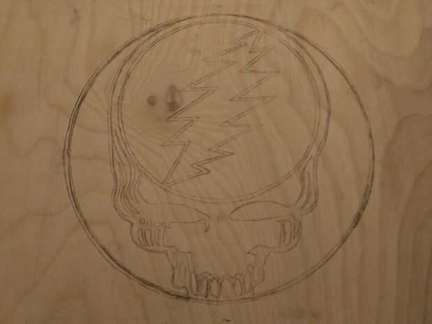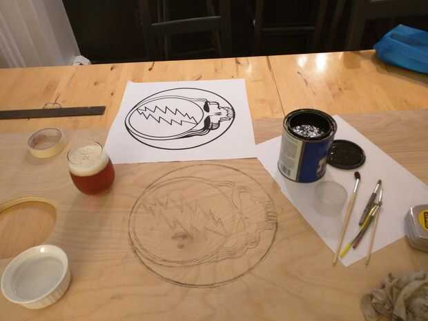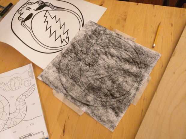 Luego tome un pedazo de lápiz carbón y cubrir la parte posterior del papel con carbón de leña. Coloque el lado del carbón de leña de imagen abajo en la cubierta en la posición deseada y se sellen bien. Utilizando un bolígrafo o un lápiz traza la imagen totalmente por correr el lápiz por toda la imagen. Esto transferirá la imagen de carbón a la cubierta de madera. Usé pintura negro para oscurecerlo.