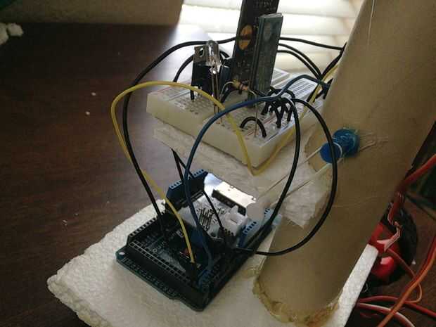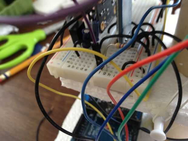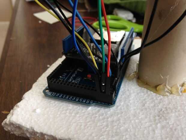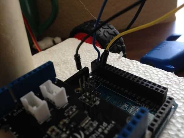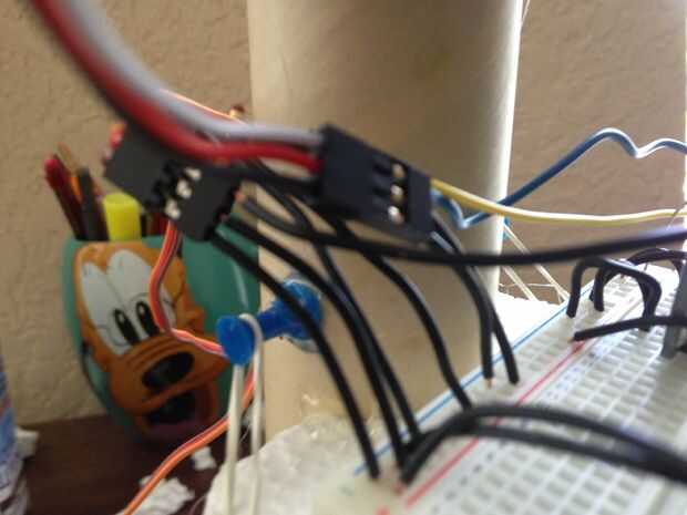 - Los servos deben estar conectados. Conecte el alambre de V de los servos (generalmente rojos) para las líneas de energía en el protoboard. Alambre de la tierra (generalmente marrón o negro) deben conectarse a las líneas de tierra de la placa. Por último pero no menos importante, conecte los cables de señal (blanco, amarillo o naranja, por lo general) a los pernos Ardunio. El servo continuo izquierdo va en el pin 22, el derecho continuo servo en el pin 24 y el estándar servo en el pin 26.