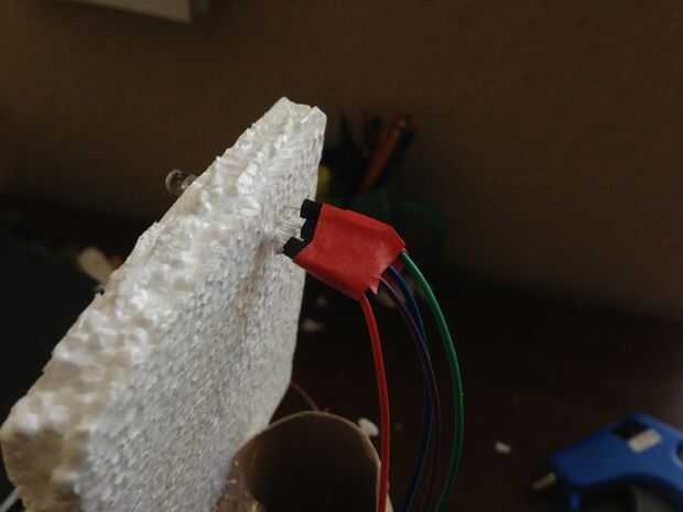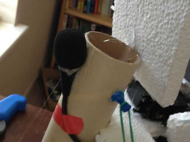 - Tomar el micrófono con el módulo de reconocimiento de voz y enchúfelo en el conector en el módulo. Tome el cable que lleva el micrófono real y enróllelo alrededor de la espina dorsal de Robbie, asegurándola con Scotch o cinta aislante.