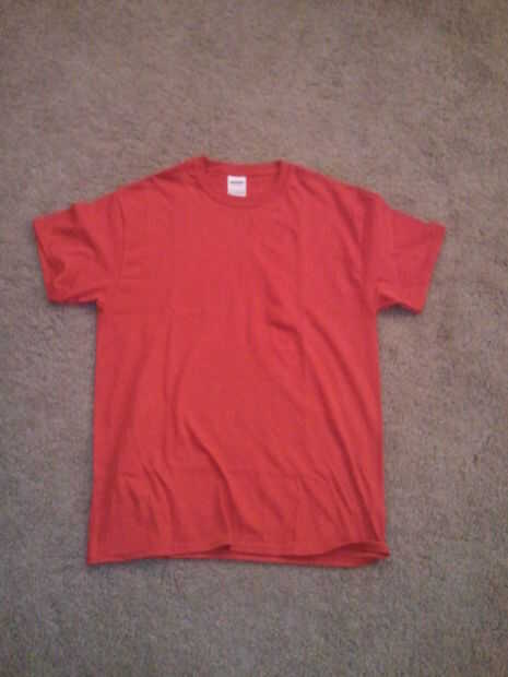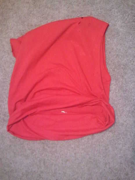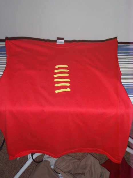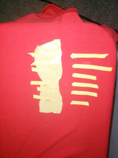 Utilice una regla en el centro de la camisa roja y marque 6 líneas, aproximadamente una pulgada aparte a ambos lados de la regla. Cortar una línea vertical, ligeramente más grande que el ancho de la cinta amarilla en 12 puntos. Tiras de cinta de alimentación a través de los agujeros.