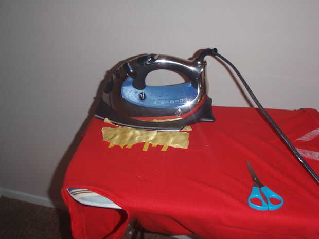Decido utilizar el material de hierro en costura. Inmovilizados de las tiras en el interior. Echa un vistazo a él en el exterior, para asegurarse de que son distancia rectas. Si no es así, ajuste hasta que estén. Ahora, si eres como yo, algunos de los agujeros son un poco demasiado grandes y mostrar a través de la camisa. Tomar un trozo de tela amarilla y utilizarlo para cubrir los agujeros. Se crea un fondo agradable y ayuda a ocultar sus errores.