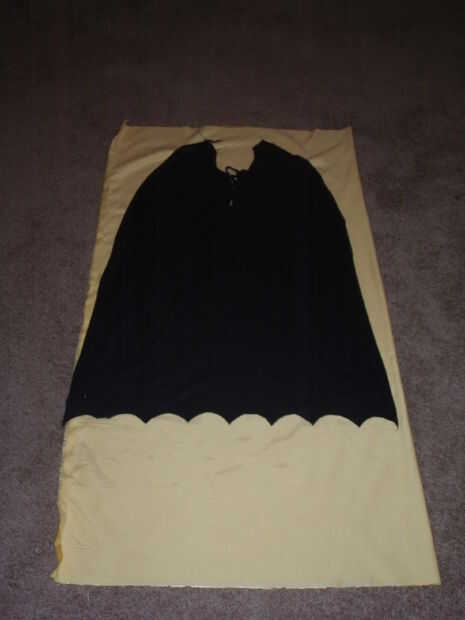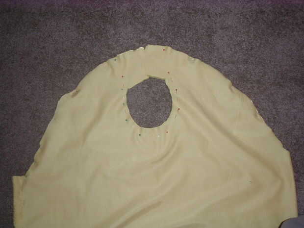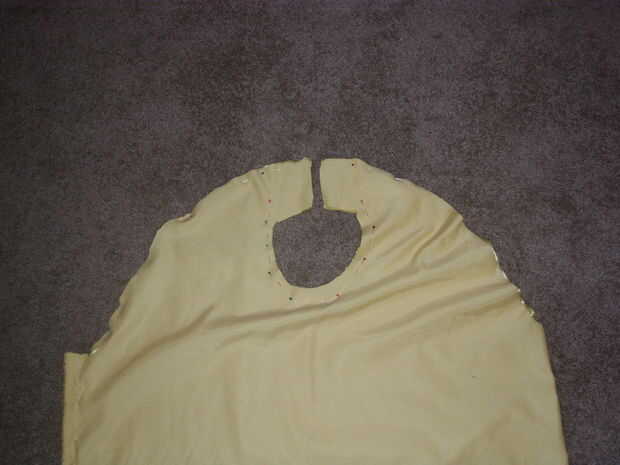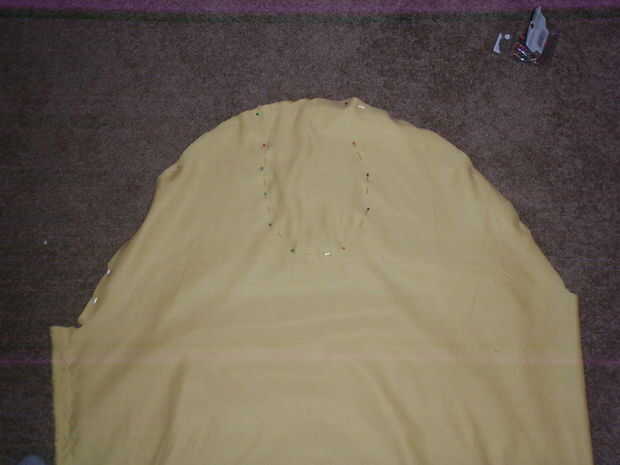 Dobla a la tela por la mitad, el lado "malo" hacia fuera y utilizar pernos de los lados para mantenerla en su lugar. Elegir una capa que no cuelgue delante de mi cuerpo y me obligan a tirarlo hacia atrás cada vez que quise usar mis brazos. En realidad tenía a cape de un niño de un Halloween anterior y utiliza para bosquejar hacia fuera la forma. Esencialmente, es un semicírculo en la parte superior un rectángulo y un círculo pequeño, oval-ish para el cuello. Soy un poco impaciente, un poco libre entregué mi corte.
