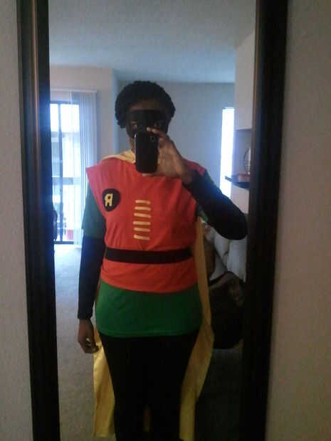El día de la estafa, las temperaturas cayeron a los 40 F. Me tiré en una camisa de manga larga, negro. Esto es totalmente opcional y ve bien. Tenía una camisa verde ya en mi armario, así que reutilizar. Terminó siendo bastante largo, así que os los cortos y llevaba medias negras. Cogí una máscara negra para un dólar y lanzó en. Originalmente tenía un gran, gran cinturón negro pero luego me acordé que tenía un marco negro de otro traje.