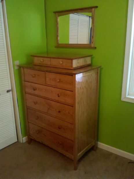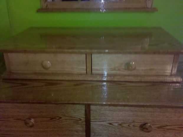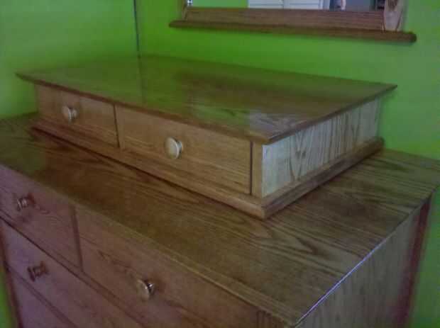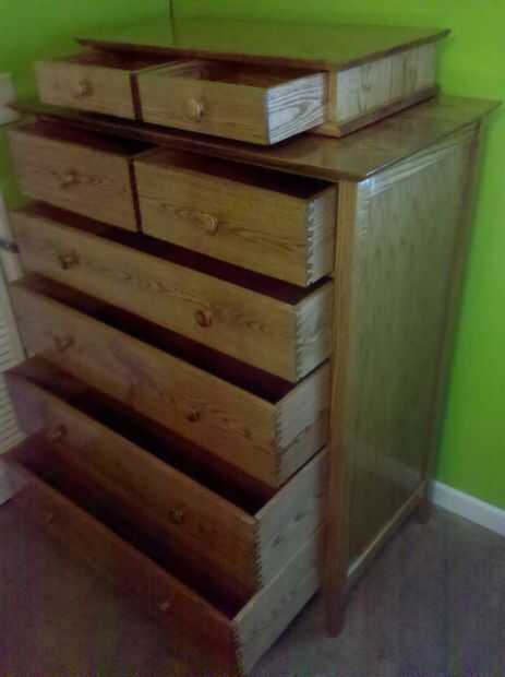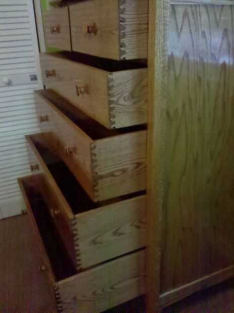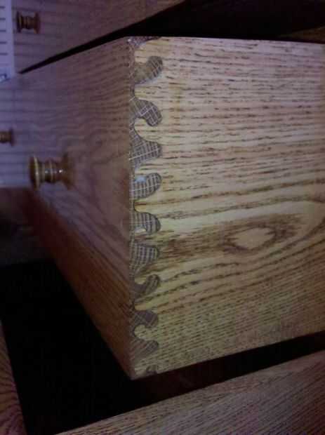 Aquí he añadido algunas fotos de mi aparador, mesita de noche, valet y espejo que hice. Cambié las juntas de cajón para colas de Milano ondulados usando una plantilla para hacerlos.